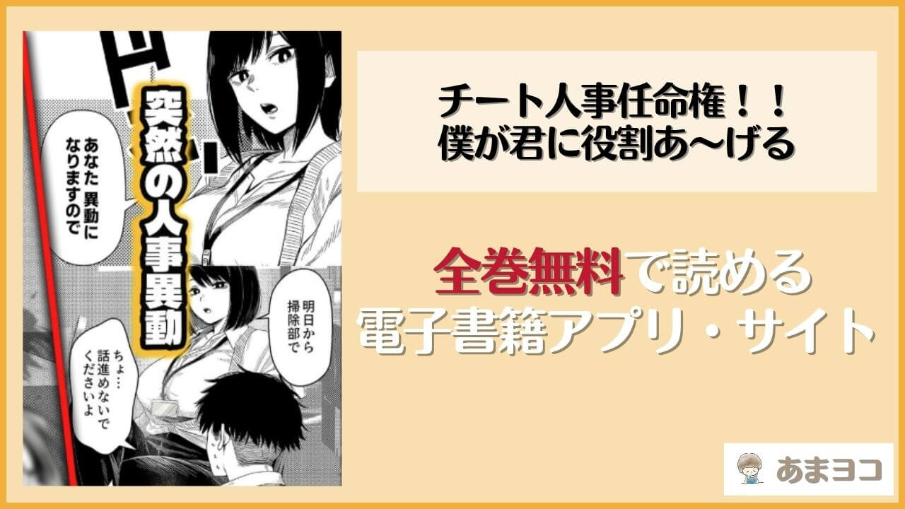 結論、チート人事任命権!!僕が君に役割あ〜げるを全ページ無料で読む方法はありません。ただ、以下の電子書籍サイトを使えば、本作を格安で購入できます